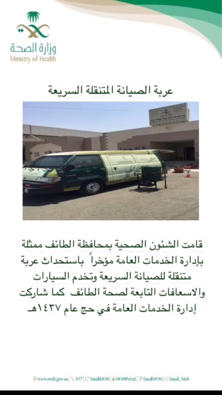 وكان وزير الصحة الدكتور توفيق الربيعة قد شاهد عرضا مرئيا عن الورشة المتنقلة، كما استمع إلى شرح مفصل عن الخدمة من مدير الشؤون الصحية بالطائف سعيد بن جابر القحطاني. مشيرا إلى أن الورشة المتنقلة عبارة عن حافلة صغيرة حولت إلى ورشة بمحتويات مختلفة، حيث يمكن من خلالها إصلاح الأعطال البسيطة التي تحدث لسيارات الإسعاف بدلا من سحبها من مواقعها.