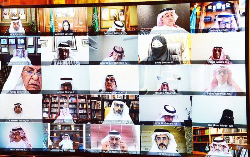 أعضاء وعضوات شوريون خلال الجلسة عبر الاتصال المرئي أمس. (واس)