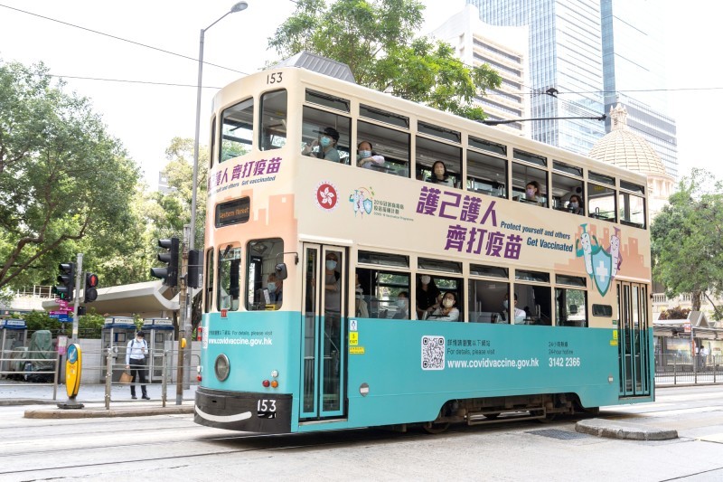 «ترام» هونغ كونغ يدعو السكان للحصول على التطعيم. (وكالات)