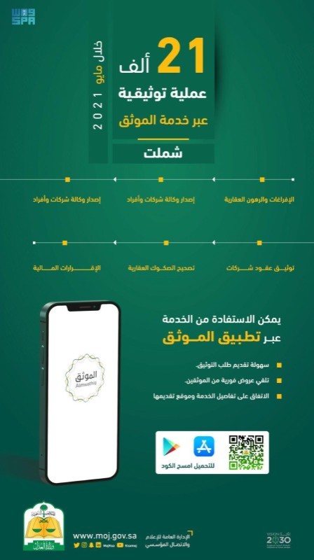 أجرت وزارة العدل 21 ألف عملية توثيقية عبر خدمة الموثق mwathiq.sa خلال شهر مايو من العام الحالي 2021.