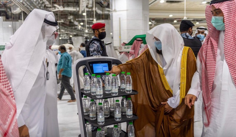 دشن الرئيس العام لشؤون المسجد الحرام والمسجد النبوي الدكتور عبدالرحمن السديس الروبوت الذكي والذي يقوم بتوزيع عبوات ماء زمزم دون تلامس.