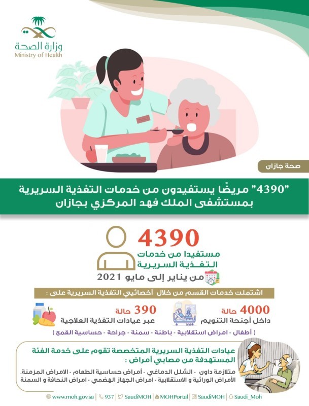 استفاد 4390 مريضاً من عيادة التغذية السريرية وأقسام التنويم بمستشفى الملك فهد المركزي بجازان، خلال الأشهر الخمسة الماضية منذ بداية يناير، وحتى نهاية شهر مايو من العام الحالي 2021م.