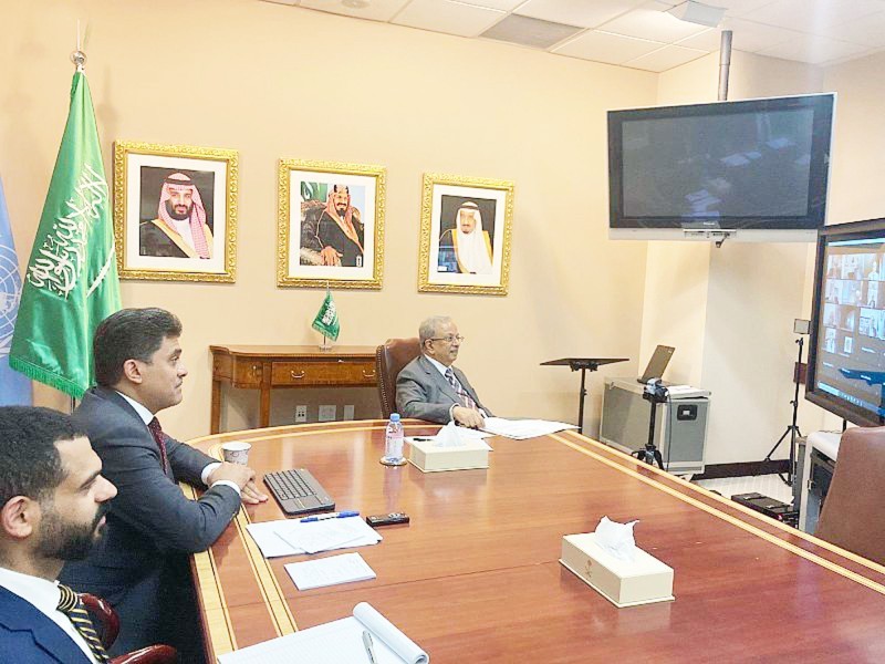 السفير المعلمي مترئساً الاجتماع الافتراضي للمجموعة العربية لدى الأمم المتحدة. (واس)