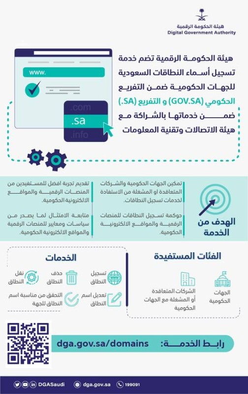 أطلقت هيئة الحكومة الرقمية خدمات تسجيل أسماء النطاقات السعودية للجهات الحكومية ضمن التفريع الحكومي (gov.sa) والتفريع (.sa)، انطلاقاً من كونها الجهة المختصة والمرجع الوطني لكل ما يتعلق بالحكومة الرقمية في المملكة، وذلك بالشراكة مع هيئة الاتصالات وتقنية المعلومات كونها الجهة المختصة بتنظيم وتشغيل أسماء النطاقات السعودية، حيث أوكلت هذه المهمة لهيئة الحكومة الرقمية تعزيزاً لدورها في تنظيم أعمال الحكومة الرقمية وتحقيقاً لحوكمة أفضل لخدمات تسجيل أسماء النطاقات الحكومية.