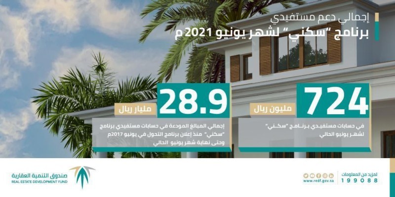 أعلن صندوق التنمية العقارية، اليوم، عن إيداعه أكثر من 724 مليون ريال في حسابات المواطنين من مستفيدي برنامج «سكني» من وزارة الشؤون البلدية والقروية والإسكان وصندوق التنمية العقارية لشهر يونيو الجاري 2021.