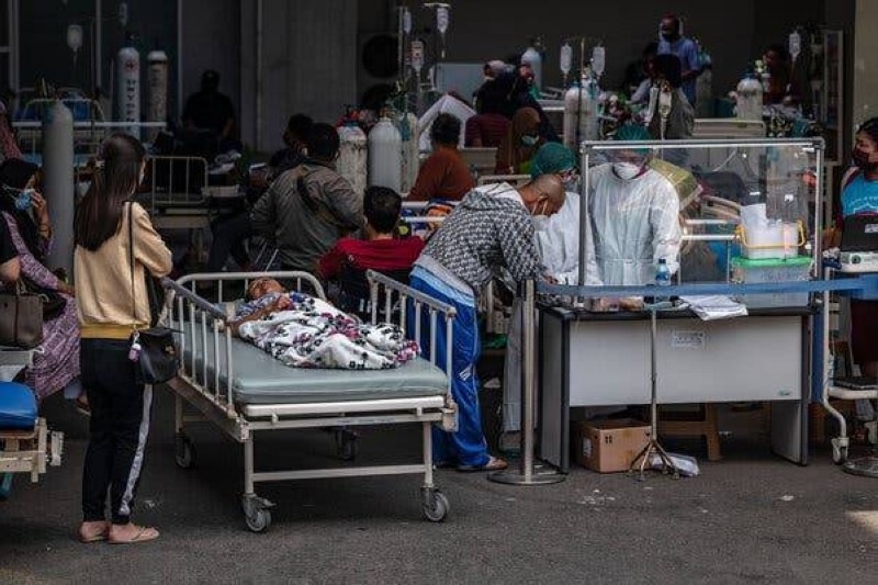 مصابون يعالجون أمام مبنى مستشفى في إندونيسيا. (وكالات)