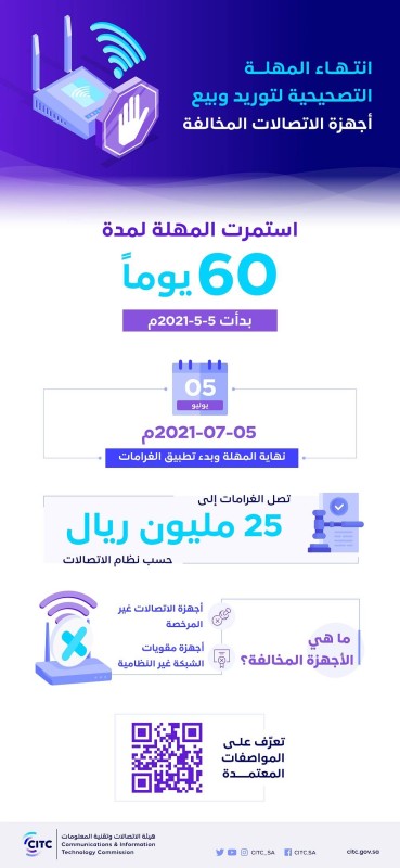 أعلنت هيئة الاتصالات وتقنية المعلومات انتهاء المهلة التصحيحية لتوريد وبيع أجهزة الاتصالات المخالفة وبدء العمل على تنفيذ الغرامات التي تصل إلى 25 مليون ريال حسب نظام الاتصالات عند رصد أي منها في الأسواق المحلية، كما حذرت الهيئة موردي أجهزة الاتصالات من توريد وتوزيع وبيع الأجهزة المخالفة للمواصفات المعتمدة من الهيئة ومن ضمنها أجهزة الاتصالات غير المرخصة وأجهزة مقويات الشبكة غير النظامية، وذلك لتفادي العقوبات المعلنة.