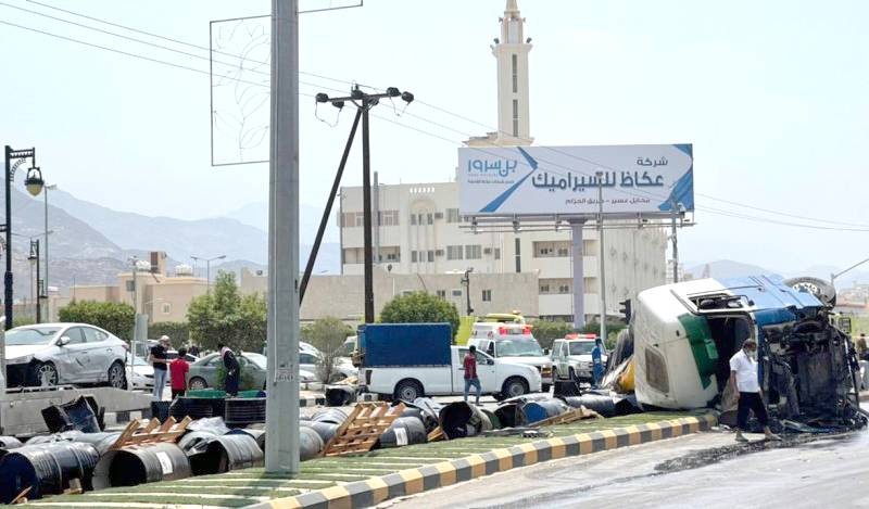 تسبب عطل في مكابح شاحنة ضخمة مسرعة محملة بالبراميل، أمس، في حادث مروري مروع، نجم عنه وفاة شخصين وإصابة 2 آخرين، بعدما فقد قائد شاحنة السيطرة عليها، واصطدم بعدد من المركبات كانت متوقفة أمام إشارة الضرس الضوئية بمحافظة محايل عسير؛ ما أدى لارتطامها العنيف بالمركبات، ثم انقلبت وتناثرت البراميل التي تحملها على الطريق.
