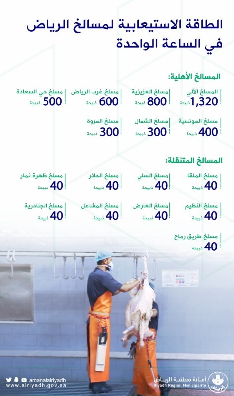 رفعت أمانة منطقة الرياض الطاقة الاستيعابية لـ16 مسلخا في العاصمة ما بين ثابت ومتنقل لتبلغ 4580 ذبيحة في الساعة، تماشيا مع حجم الإقبال الذي تشهده المسالخ خلال أيام عيد الأضحى المبارك.