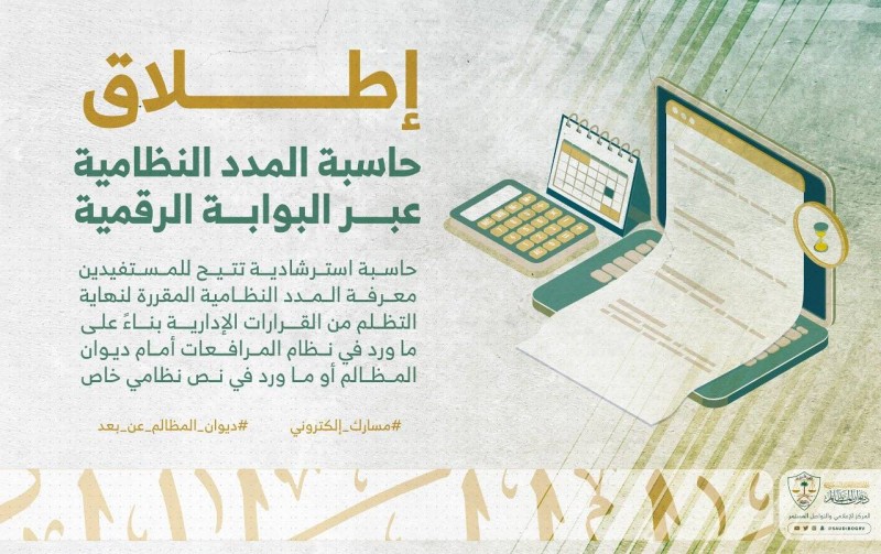 أطلق ديوان المظالم خدمة حاسبة المدد النظامية، التي تتيح معرفة المدد النظامية المقررة لنهاية التظلم من القرارات الإدارية، بناءً على ما ورد في نظام المرافعات أمام ديوان المظالم أو ما ورد في نص نظامي خاص، وذلك بحسب المدخلات من المستفيد.