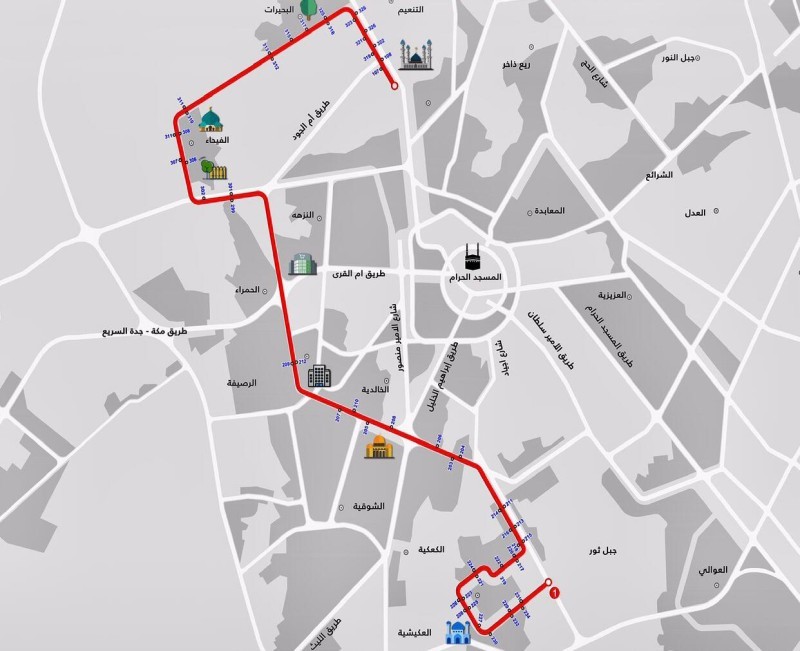 حدد مشروع النقل العام للحافلات بمكة المكرمة أبرز المعالم الرئيسية التي ستمر بها الحافلات عند اكتمال المشروع.