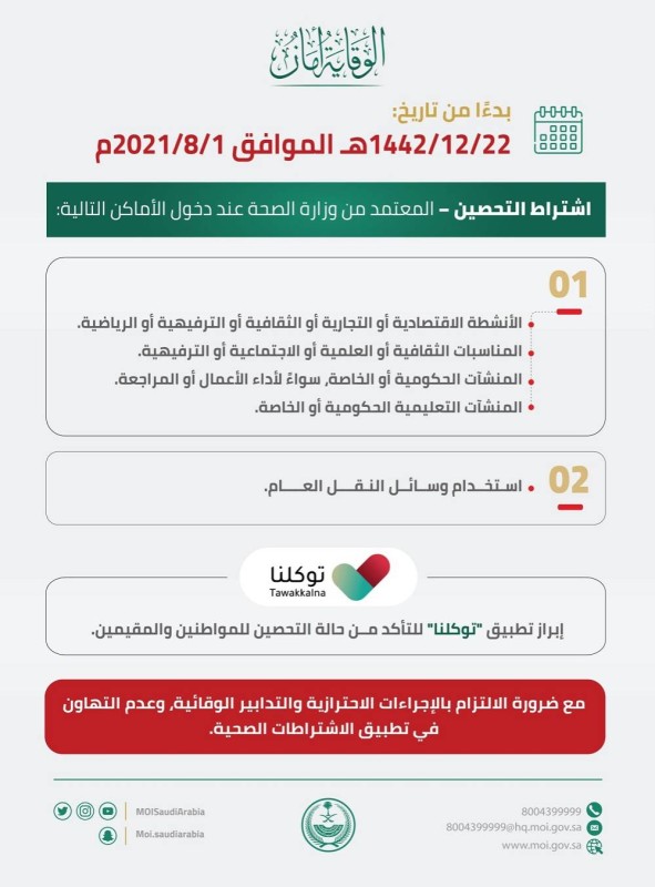 وأكدت الوزارة، عبر حسابيها في «تويتر» و«سناب شات»، أن دخول أي نشاط اقتصادي أو تجاري أو ثقافي أو ترفيهي أو رياضي، أو أي مناسبة ثقافية أو علمية أو اجتماعية أو ترفيهية، أو أي منشأة حكومية أو خاصة، سواء لأداء الأعمال أو المراجعة، أو أي منشأة تعليمية حكومية أو خاصة، وعند استخدام وسائل النقل العامة، يلزم إبراز تطبيق «توكلنا» للتأكد من حالة التحصين للمواطنين والمقيمين.