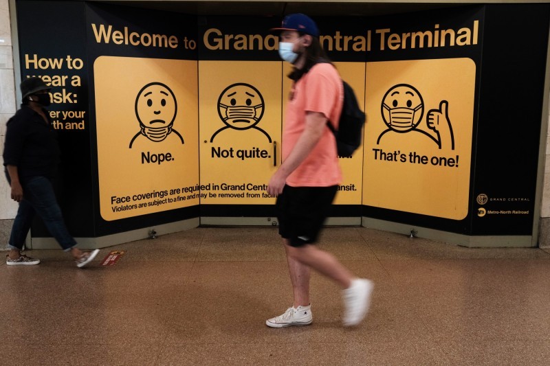 لوحة توضح الكيفية الصحيحة لارتداء الكمامة في مترو نيويورك. (وكالات)