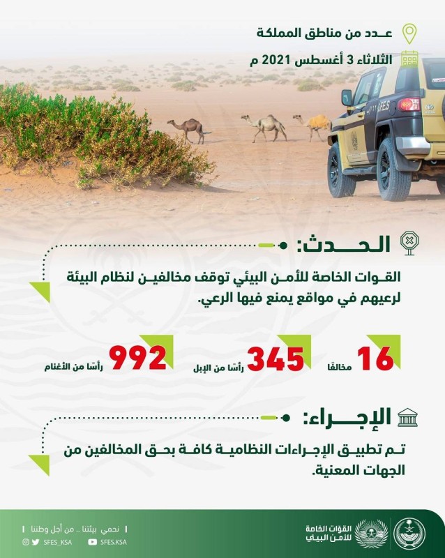 أوقفت القوات الخاصة للأمن البيئي 16 مخالفاً لنظام البيئة، منهم 7 مواطنين و9 مقيمين من الجنسيتين السودانية والهندية، ارتكبوا مخالفات رعي 345 رأساً من الإبل و992 رأساً من الأغنام في أماكن يُمنع فيها الرعي في عدد من مناطق المملكة.