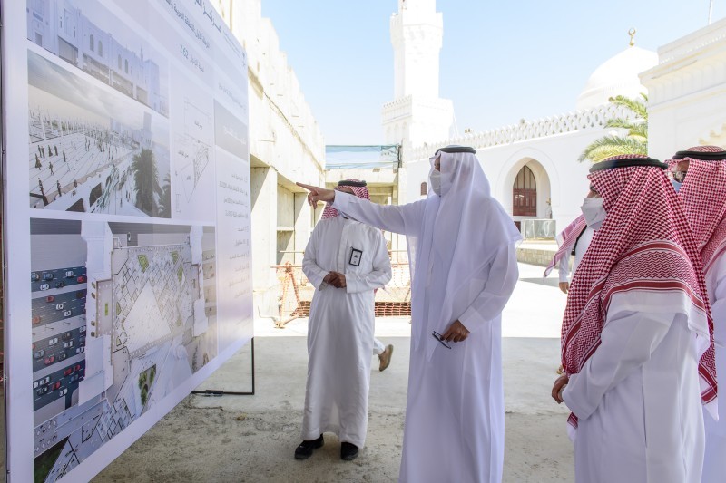 واستمع خلال الجولة الميدانية على منطقة المشروع لشرح من الرئيس التنفيذي للهيئة المهندس فهد بن محمد البليهشي، عن أعمال المرحلة الواقعة بنطاق الجهة الغربية والشمالية من الموقع، التي تهدف إلى إضافة بُعدٍ جديد للأهمية التاريخية للمسجد، وزيادة الطاقة الاستيعابية بنحو 3 آلاف مصلٍ، ورفع مستوى جودة الخدمات المقدمة للمصلين وزوار المنطقة. ويُعد مشروع تطوير مسجد القبلتين والمنطقة المحيطة به، أحد المشاريع الحضارية التي تُجسد مستوى الرعاية والعناية التي تقدمها حكومة خادم الحرمين الشريفين الملك سلمان بن عبدالعزيز آل سعود بالمعالم الدينية والتاريخية في المدينة المنورة، في ظل ارتباط المسجد بقصة تحوّل القبلة من المسجد الأقصى إلى المسجد الحرام، وبما يُساهم في إثراء تجربة الزوار ورفع مستوى جودة الحياة بالمدينة المنورة. وتتضمن أعمال المرحلة الأولى للمشروع إنشاء ساحات جديدة مُخصصة للصلاة، بالإضافة إلى المواقف وساحات الأنشطة على مساحة 3200 متر مربع، وجسرٍ لمُشاة بمساحة 8100 متر مربع، وتهيئة 4 مصاعد و18 سلماً كهربائياً، إلى جانب استحداث 4 مجمعات رئيسية للوضوء، وتجهيز مباني الخدمات العامة، وتهيئة مناطق الاستراحة والانتظار في محيط المسجد، وذلك في إطار تحسين وتطوير مستوى الخدمات المقدمة للمصلين، كما يتضمن المشروع تحسين المشهد الحضري المحيط بالمسجد، وإعادة هيكلة المداخل والمخارج والممرات، وتحسين مواقع الخدمات ومواقف السيارات لخدمة المصلين. في حين تتضمن المرحلة الثانية والثالثة من المشروع التي سيتم تنفيذها مستقبلاً، إنشاء وتجهيز مواقف سطحية على مساحة 18 ألف متر مربع، وكذلك إنشاء المركز الثقافي بمساحة 600 متر مربع، ومركز المعلومات، ومبنى مخصص للمعارض يضم 5 قاعات رئيسية، إلى جانب المركز التجاري بإجمالي 35 منفذ بيع، ومبنى الممر المرتبط بحديقة القبلتين، وتهيئة 50 موقفا للحافلات. فيما ستُعنى المرحلة الثالثة بتأهيل وتطوير الأحياء السكنية المحيطة بمسجد القبلتين على مساحة 215 ألف متر مربع، وذلك من خلال إضافة عناصر عمرانية وتثقيفية وخدمية ووسائل إرشادية تُبين القيمة الدينية والرمزية للموقع بما يُساهم في تحقيق التنمية العمرانية والاقتصادية، وإعادة تأهيل المناطق المُحيطة، ومعالجة حالات التشوه البصري، وحماية النسيج والمواقع الحضرية، وتنمية الأنشطة الاجتماعية والثقافية وتوفير المرافق والخدمات العامة لخدمة الأهالي وزوار المسجد، وتعزيز القيمة التاريخية للمنطقة، إلى جانب إيجاد عناصر عمرانية جاذبة في نطاق المشروع.
