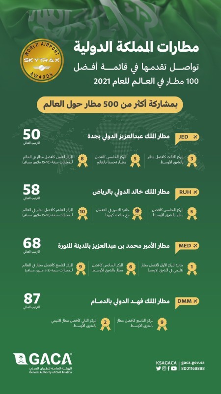ووفقاً لنتائج التقييم لهذا العام 2021، جاء مطار الملك عبدالعزيز الدولي في صدارة المطارات السعودية الدولية في المرتبة الـ50 عالمياً، وتقدم مطار الملك خالد الدولي 36 مرتبة ليصبح في المركز الـ58، ومطار الأمير محمد بن عبدالعزيز إلى المركز 68 متقدماً 16 مركزاً، كما احتلّ مطار الملك فهد الدولي المركز الـ87 بعد أن كان تصنيفه الـ91 عالمياً.