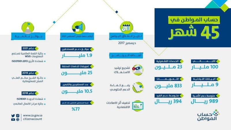 من جهته، أوضح المتحدث باسم برنامج حساب المواطن سلطان القحطاني أن متوسط دعم الأسرة الواحدة أكثر من 989 ريالا لكل أسرة مستفيدة، وبلغ متوسط دعم الفرد المستقل 394 ريالا على مدى السنوات الماضية، وقدم البرنامج أكثر من 23 مليون خدمة تشغيلية على جميع منصاته الممثلة في «صوتك مسموع» و«مركز الاتصال» و«حساب خدمة المستفيدين» و«الحساب الرسمي للبرنامج» و«حساب المتحدث الرسمي على منصة التواصل الاجتماعي تويتر»، إضافة إلى مراجعة وتدقيق المستندات التي تم التحقق منها والطلبات التقنية والاعتراضات، فيما تخطت أرقام البيانات التبادلية مع شركاء البرنامج أكثر من 9 مليارات عملية.