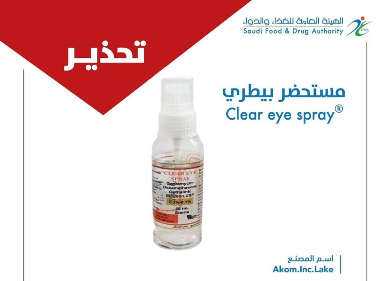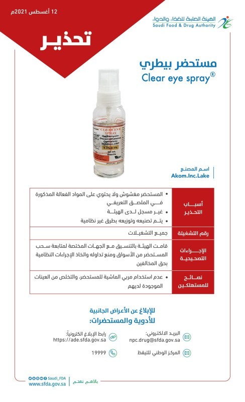 حذرت الهيئة العامة للغذاء والدواء من دواء بيطري مغشوش يحمل اسم clear eye spray من إنتاج مصنع Akom.Inc.Lake، حيث يعد مستحضراً دوائياً بيطرياً غير مسجل لدى الهيئة، وتم اكتشافه خلال الحملات التفتيشية المشتركة مع وزارة البيئة والمياه والزراعة، وبعد التحقيق مع الصيدليات البيطرية تبين أن الدواء يتم توزيعه وتصنيعه بطرق غير نظامية.