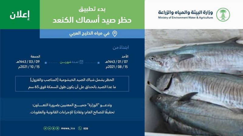 أعلنت وزارة البيئة والمياه والزراعة أمس (الأحد)، بدء سريان حظر صيد أسماك الكنعد ومنع استخدام شباك الصيد «الخيشومية» على سواحل الخليج العربي، وذلك حتى تاريخ 15 أكتوبر 2021.