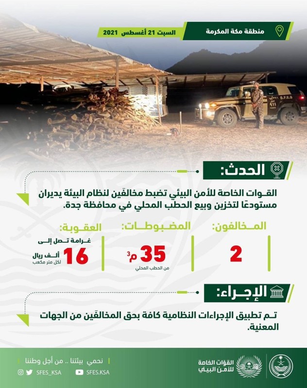 ضبطت القوات الخاصة للأمن البيئي مواطناً ومقيماً من الجنسية المصرية يديران مستودعاً لتخزين وبيع الحطب المحلي في محافظة جدة يحتوي على 35 متراً مكعباً من الحطب و3 عربات نقل.
