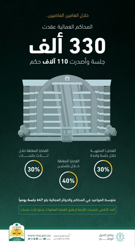 كشفت وزارة العدل عن آخر المستجدات في أعمال المحاكم العمالية، حيث بلغ إجمالي الأحكام الصادرة خلال العامين الماضيين 110 آلاف حكم عمالي، فيما بلغ إجمالي الجلسات المنعقدة خلال الفترة ذاتها أكثر من 330 ألف جلسة.