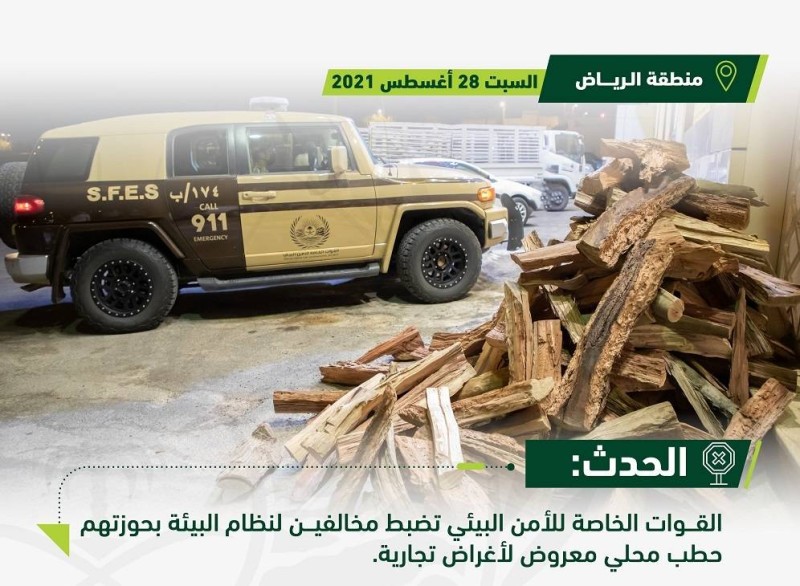 ضبطت القوات الخاصة للأمن البيئي بالتعاون مع أمانة منطقة الرياض 48 مواطناً مخالفاً لنظام البيئة بحوزتهم (25) متراً مكعباً من الحطب المحلي المعروض لأغراض تجارية بمدينة الرياض.