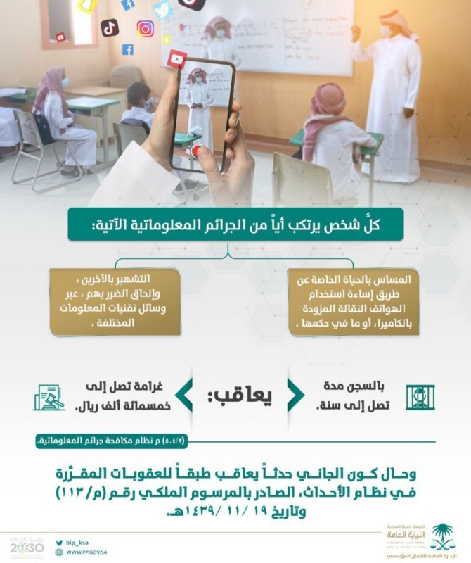 مع العودة الحضورية الآمنة لطلاب التعليم وفق الإجراءات الاحترازية التي من ضمنها حمل الطلاب والطالبات جوالاتهم داخل المدرسة، حيث لن يسمح لهم بالدخول إلى مدارسهم إلا بعد إبراز تطبيق «توكلنا» للتأكد من أخذهم للجرعتين من لقاح كورونا، حذرت النيابة العامة الطلاب من التعدي على خصوصية الآخرين داخل المنشآت التعليمية وتصويرهم لزملائهم بكاميرا الجوال ونشرها في مواقع التواصل الاجتماعي أو الاحتفاظ بها داخل جولاتهم. وصرح لـ«عكاظ» المتحدث باسم النيابة العامة الدكتور ماجد الدسيماني أن كل شخص يرتكب أياً من الجرائم المعلوماتية سواء المساس بالحياة الخاصة عن طريق إساءة استخدام الهواتف النقالة المزودة بالكاميرا أو ما في حكمها، أو التشهير بالآخرين وإلحاق الضرر بهم عبر وسائل تقنيات المعلومات المختلفة سوف يعاقب بالسجن مدة تصل إلى سنة وغرامة مالية تصل إلى 500 ألف ريال، وحال كون الجاني حدثاً يعاقب طبقا للعقوبات المقررة في نظام الأحداث الصادر بالمرسوم اللكي رقم ( م/١١٣) وتاريخ ١٤٢٩/١١/١٩.
