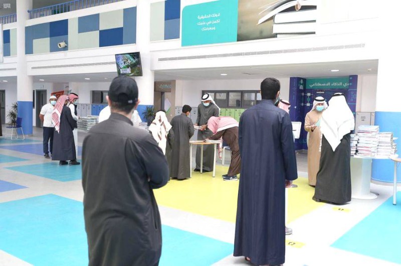 طلاب يتسلمون كتبهم الدراسية وَفْق آلية زمنية وتطبيق الإجراءات الاحترازية. (واس)