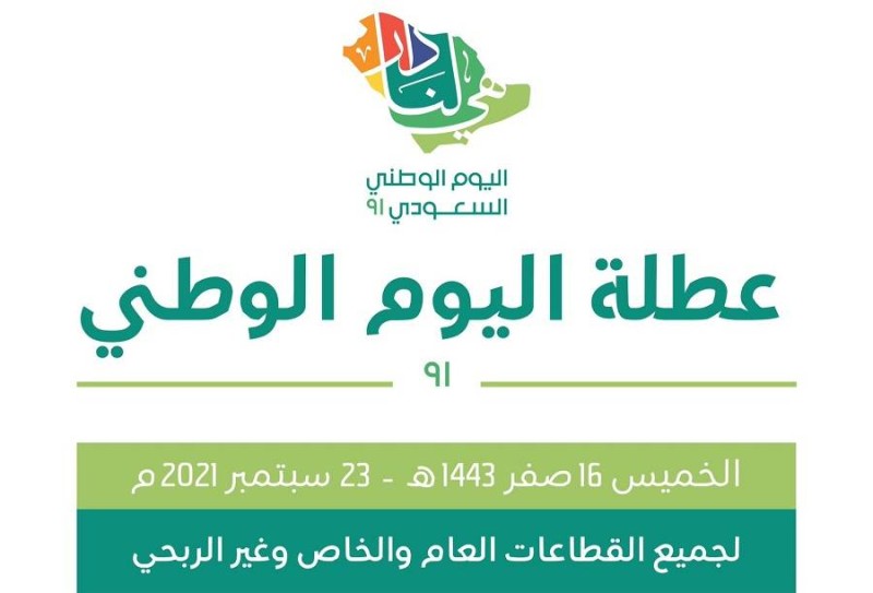 وأعلنت وزارة الموارد البشرية والتنمية الاجتماعية، أن يوم الخميس 23 سبتمبر الجاري الموافق 16 صفر 1443 سيكون إجازة لجميع القطاعات (العام، الخاص، غير الربحي)، وذلك وفقا للمادة 24 من اللائحة التنفيذية لنظام العمل، ووفقا للفقرة (ب) من المادة 127 والمادة 128 من اللائحة التنفيذية للموارد البشرية.