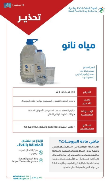 حذرت الهيئة العامة للغذاء والدواء من استهلاك مياه «نانو» حجم (250 مل، 2 لتر، 5 لترات)، من إنتاج مصنع شركة أبناء محمد إبراهيم الحازمي «مصنع نانو» في محافظة القنفذة بمنطقة مكة المكرمة، وذلك لتجاوزها الحدود القصوى المسموح بها من مادة البرومات.
