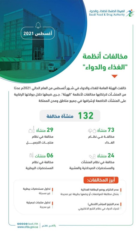 خالفت الهيئة العامة للغذاء والدواء في شهر أغسطس الجاري 132 منشأة لارتكابها عدداً من المخالفات لأنظمة «الهيئة»، وذلك خلال جولاتها الرقابية التي تنفّذها على المنشآت الخاضعة لإشرافها في جميع مناطق ومدن المملكة.
