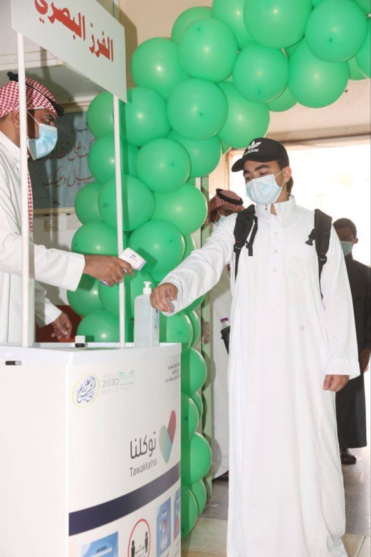 طالب يخضع لقياس درجة الحرارة قبل دخوله المدرسة. (تصوير: مديني عسيري)