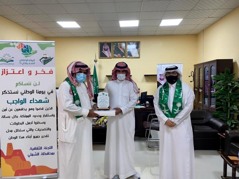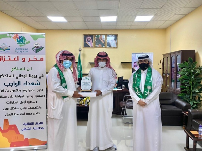 وأوضح رئيس اللجنة الثقافية بمحافظة الشملي بندر شليويح العنزي أن اللجنة أقامت خلال فعاليات اليوم الوطني للمملكة الـ 91 عددا من الفعاليات والمبادرات ومنها تكريم عدد من أُسر شهداء الواجب في المحافظة تحت شعار «لن ننساكم في يومنا الوطني» بدروع تذكارية وهدايا عينية، تهدف إلى تعظيم ما أنجزه ذووهم من شهداء الحد الجنوبي والوطن.