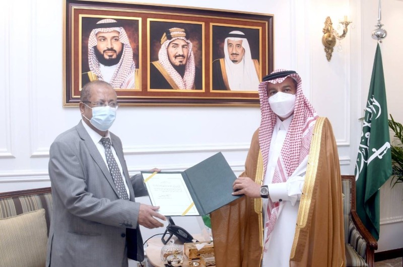 سلم مدير عام فرع وزارة الخارجية بمنطقة مكة المكرمة مازن بن حمد الحملي من القنصل العام للجمهورية اليمنية بجدة علوي محمد عبدالقادر بافقيه الإجازة القنصلية خلال استقباله له في جدة اليوم (الأحد).