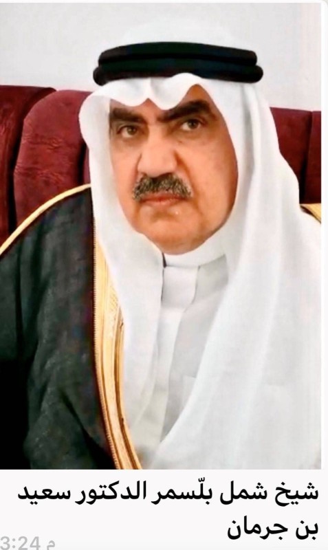 وقال شيخ شمل قبائل بلّسمر الدكتور سعيد بن طراد بن جرمان: «نحمد الله على نعمه الكثيرة ونشكر الله سبحانه وتعالى على أن منّ علينا بحكومة ترعى المواطن والمقيم وتُقيم العدل وتدعونا إلى المحبة والتسامح والإخاء وإصلاح ذات البين وندعو الله أن يحفظ لنا خادم الحرمين الشريفين وولي عهده الأمين وأمير منطقة عسير راعي الإصلاح والصلاح والتنمية في عسير، فقد تمّ ولله الحمد لقاء المحبة والصلح والتآخي بين أبناء قبيلة آل مطير من تهامة بلّسمر بعد خلاف طال لسنوات عديدة، وبجهود من المخلصين من شيوخ وأعيان بلّسمر تمت عودة الوئام والصلح وطويت صفحة من القطيعة، فأشكر أبناء قبيلة آل مطير الذين تعاونوا معنا على إنهاء القطيعة وإتمام الصلح وأشكر الشيوخ والنواب والأعيان الذين أسهموا في هذا الصلح، وندعو الله أن يديم المحبة وأن يسود إصلاح القلوب قبل الدروب بيننا».