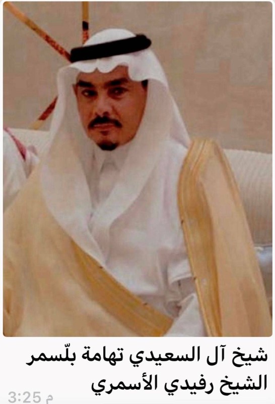 وقال شيخ قبيلة آل السعيدي الشيخ رفيدي بن عايض آل براك الأسمري: «لقد تشرفنا في لجنة الإصلاح من قبيلة آل السعيدي تهامة بلّسمر بالتدخّل في الصُلح وإنهاء الخلاف بين أفراد قبيلة آل مطير الذي دام سنوات طويلة، بطلب مقدّم منهم وقد لبّينا طلبهم بعد أخذ الإذن والسماح لنا من أخي وزميلي الشيخ زاهر بن محمد الاسمري شيخ قبيلة بني مالك تهامة بلّسمر، ومتابعة وتوجيهات من شيخ شمل قبائل بلّسمر وقد أخذ هذا الصلح أكثر من خمسة أشهر ونحن نحاول تقريب وجهات النظر، وبفضل من الله ثم تعاونهم معنا تمّ الصلح وتوحيد الصف وجمع الكلمة وأُعيدت الأمور إلى سابق عهدها على يد واحدة وسط فرحة غامرة بهذه العودة، وقد سعدنا كثيراً بانتهاء الخلاف، وهذا بفضل الله سبحانه وتعالى ثم بفضل قيادتنا الحكيمة والرشيدة التي دستورها الكتاب والسنة بقيادة مولاي خادم الحرمين الشريفين الملك سلمان بن عبدالعزيز وولي عهده الأمين الأمير محمد بن سلمان بن عبدالعزيز وحرصهم الكبير ودعمهم اللامحدود لكل ما يصلح لهذا الوطن ومواطنيه، والشكر موصول لأمير منطقة عسير الأمير تركي بن طلال بن عبدالعزيز الذي أولى جُلّ اهتمامه لإصلاح ذات البين، ومنها لجنة إرساء السلم المجتمعي وكلمته المشهورة حفظه الله (إصلاح القلوب قبل إصلاح الدروب)، أدام الله على بلادنا أمنها واستقرارها في ظل قيادتنا الرشيدة إنه ولي ذلك والقادر عليه».