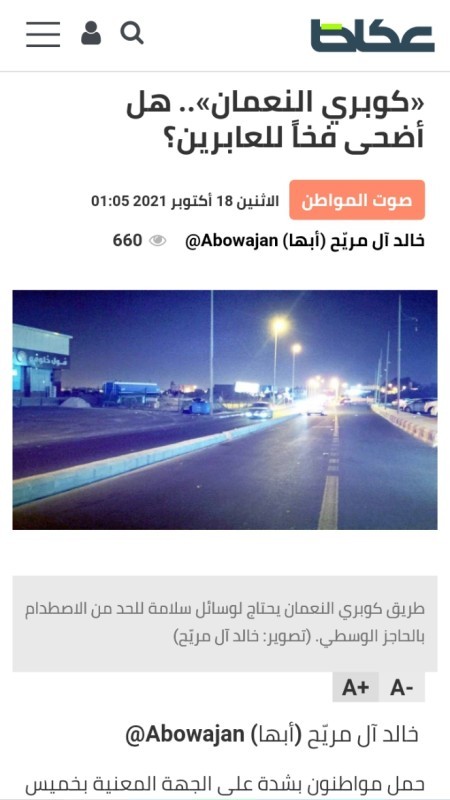 أكد مدير الإدارة العامة للمرور في المملكة اللواء سلمان الجميعي، في اتصال تلقته «عكاظ»، وتجاوباً مع ما نشرته في عددها الصادر يوم الاثنين الماضي في مادة بعنوان «كوبري النعمان».. هل أضحى فخاً للعابرين؟ أنه في طور تنسيق الإدارة العامة للمرور الحالي مع الجهات ذات الاختصاص المعنية بإنشاء الطرق لاستكمال وسائل السلامة على طريق كوبري النعمان بمحافظة خميس مشيط، مضيفاً أن لجان السلامة المرورية في مناطق ومحافظات المملكة، تعمل على رصد ومتابعة أعمال الطرق، وكل ما يؤثر على مستوى السلامة المرورية من خلال لجان عليا وتنفيذية ومحلية منبثقة من توجيه وزير الداخلية، والتي تحظى بدعم أمراء المناطق.