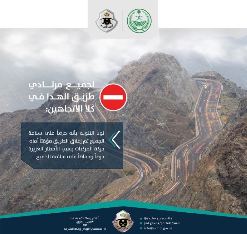 ‏أعادت الجهات ذات العلاقة فتح طريق الهدا، بعد إغلاقه احترازيا بسبب الأمطار. وقالت دوريات أمن الطرق على حسابها في «تويتر»: «عزيزي قائد المركبة: نود التنويه بأنه تم إغلاق طريق الهدا (مؤقتًا) بالاتجاهين لوجود أمطار غزيرة حرصاً على سلامة الجميع». فيما أعلنت إمارة منطقة مكة المكرمة إعادة فتح الطريق.