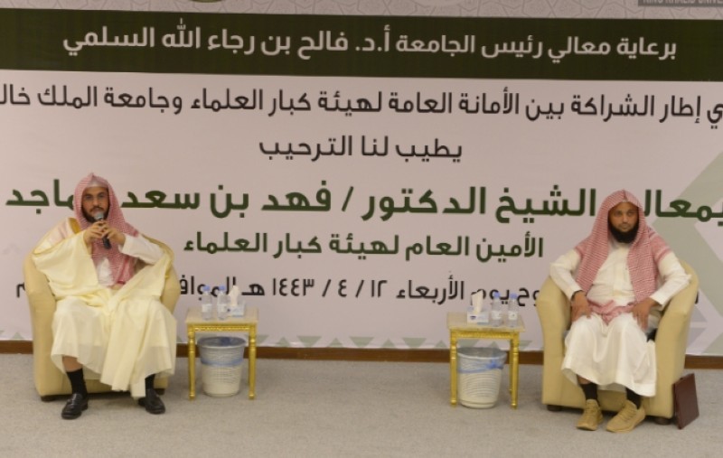 شهد رئيس جامعة الملك خالد الدكتور فالح السلمي، اليوم، لقاء الأمين العام لهيئة كبار العلماء الشيخ الدكتور فهد الماجد، بمنسوبي ومنسوبات جامعة الملك خالد، وطلاب المنح الدوليين، وذلك ضمن برنامج «زيارة عالم»، الذي تنظّمه الجامعة ممثلة في وحدة التوعية الفكرية، بالشراكة مع الأمانة العامة لهيئة كبار العلماء.