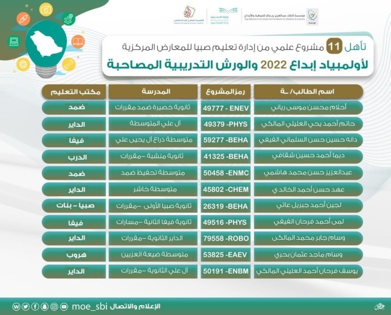وذكر مدير تعليم صبيا د. حسن خرمي أن عدد طلبة تعليم صبيا المسجلين في المشروع بلغ 2996 طالبا وطالبة فيما بلغت الملفات المرشحة للمنافسة في المعارض المركزية للأولمبياد 265 ملفا ومشروعا بواقع 87 للبنين و178 ملفاً للبنات. ومن ثم ترشيح ورفع أفضل المشاريع للمشاركة في معرض إبداع للعلوم والهندسة «ISEF».