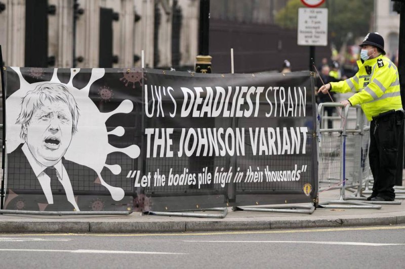 شرطي بريطاني قرب لافتة لمناهضي اللقاحات تندد بـ «متحورة جونسون»! (وكالات)