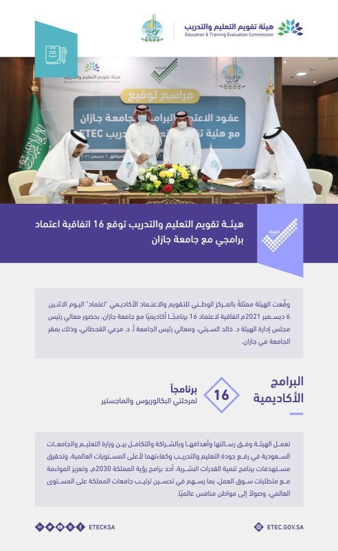 وقَّعت هيئة تقويم التعليم والتدريب، ممثلة بالمركز الوطني للتقويم والاعتماد الأكاديمي «اعتماد»، صباح اليوم (الاثنين) 6 ديسمبر 2021، اتفاقية لاعتماد 16 برنامجا أكاديميا في جامعة جازان، بحضور رئيس مجلس إدارة الهيئة د. خالد بن عبدالله السبتي، ورئيس الجامعة أ. د. مرعي بن حسين القحطاني، في قاعة الاجتماعات بالبرج الإداري في المدينة الجامعية في مدينة جازان.
