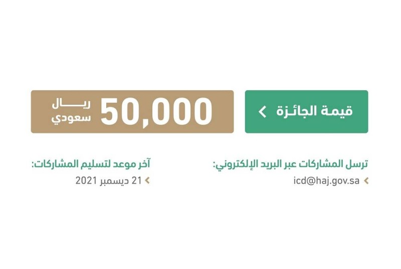 ودعت «الحج والعمرة» إلى إرسال المشاركات عبر البريد الإلكتروني icd@haj.gov.sa، مؤكدة أن آخر موعد لتسليم المشاركات 21 ديسمبر 2021.