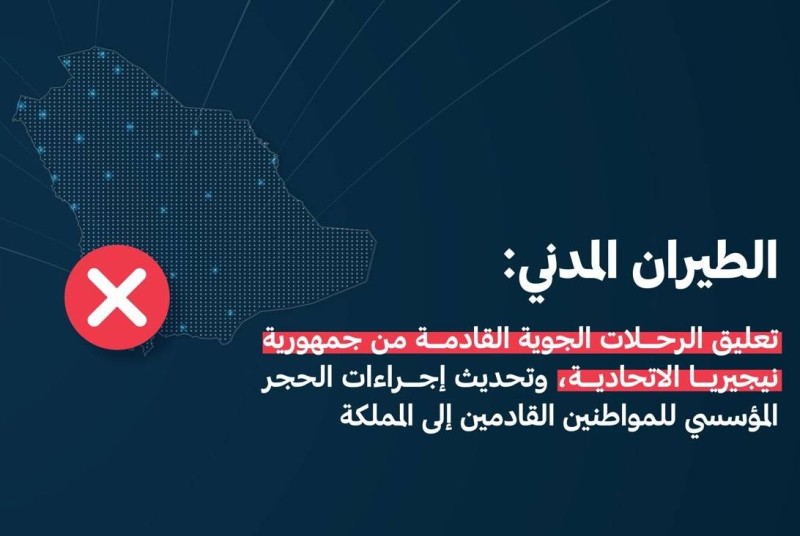 أصدرت الهيئة العامة للطيران المدني تعليماتها للناقلات الجوية بشأن تعليق الرحلات الجوية القادمة من جمهورية نيجيريا الاتحادية وإليها، وتحديث إجراءات الحجر المؤسسي المعتمدة للمواطنين القادمين إلى المملكة من الدول المعلق القدوم منها.