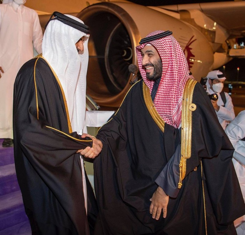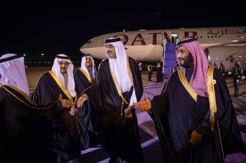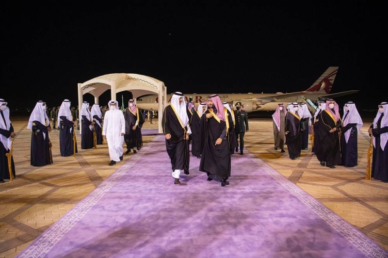 كما وصل أمير دولة قطر الشيخ تميم بن حمد آل ثاني، وكان في استقباله في الصالة الملكية بمطار الملك خالد الدولي، ولي العهد نائب رئيس مجلس الوزراء وزير الدفاع الأمير محمد بن سلمان بن عبد العزيز، الذي رحب به وبمرافقيه في السعودية.