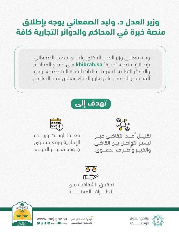 وتهدف منصة «خبرة» khibrah.sa إلى تقليل أمد التقاضي عبر تسهيل التواصل بين القاضي والخبير وأطراف الدعوى، وتحقيق العدل والشفافية بين الأطراف المعنية، وحفظ الوقت وزيادة الإنتاجية ورفع مستوى جودة تقارير الخبرة.
