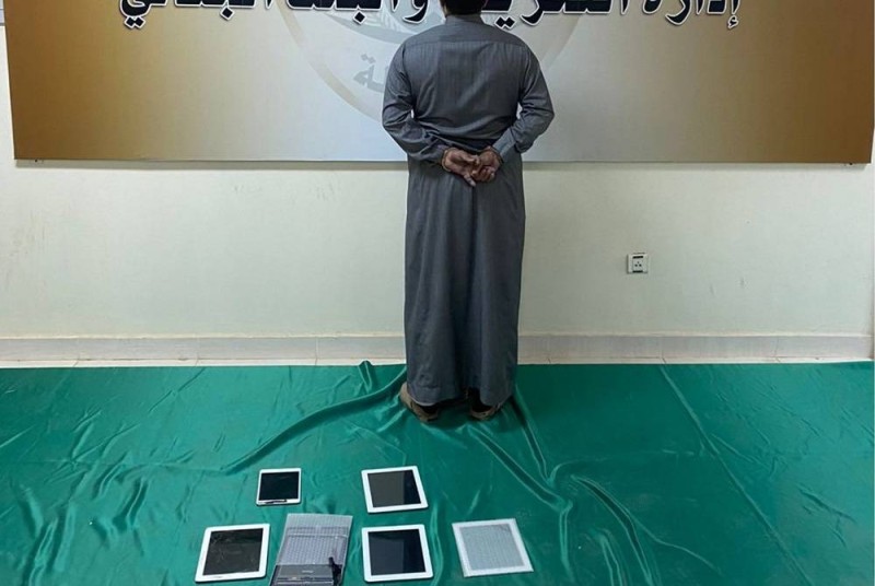 الجاني بعد القبض عليه وتظهر الأجهزة المسروقة التي تم استردادها (الأمن العام)