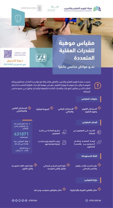 وأكدت الهيئة ممثلة بالمركز الوطني للقياس، أن قرابة نصف مليون طالبٍ وطالبة أدوا مقياس موهبة للقدرات العقلية المتعددة منذ بداية إطلاقه بشكل فعلي عام 2011 بالتعاون مع مؤسسة الملك عبدالعزيز ورجاله للموهبة والإبداع (موهبة) ووزارة التعليم، حيث بلغ عدد الطلاب الذين تقدموا لأداء المقياس (200.112) طالبا و(230.959) طالبة، ويهدف المقياس إلى اكتشاف الطلبة ذوي القدرات المرتفعة في أربعة أبعاد، هي: المرونة العقلية، والاستدلال العلمي والميكانيكي، والاستدلال اللغوي وفهم المقروء، والاستدلال الرياضي والمكاني.