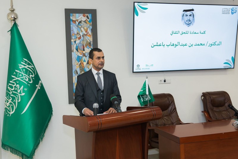 وبدأ الحفل بكلمة ترحيبية للملحق الثقافي الدكتور محمد باعشن تحدث فيها عن مكانة اللغة العربية وأهميتها لدى قيادات المملكة في الماضي والحاضر، والجهود العظيمة التي تُبذل في سبيل خدمتها ونشرها عبر المؤسسات الحكومية والخاصة بالمملكة، مشيراً في كلمته إلى دور الجامعات والمؤسسات التعليمية الكبير في تعليم ونشر اللغة العربية بكلياتها ومعاهدها داخل وخارج المملكة للناطقين وغير الناطقين بها بإشراف ودعم وزارة التعليم، إضافة إلى الدور البارز في خدمة اللغة العربية من قبل مركز الملك عبدالله بن عبدالعزيز الدولي لخدمة اللغة العربية، ومجمع الملك سلمان العالمي للغة العربية، ومؤسسة سلطان بن عبدالعزيز الخيرية.