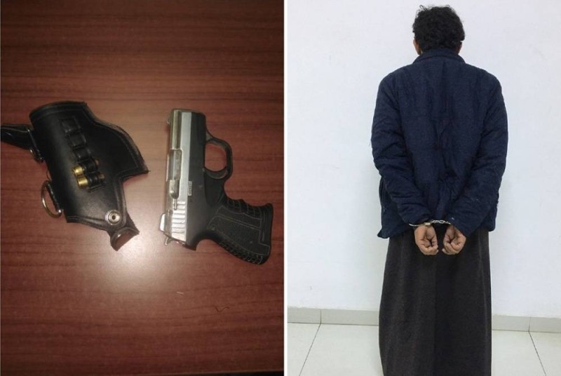 الجاني بعد القبض عليه ويظهر السلاح المضبوط بحوزته (الأمن العام)